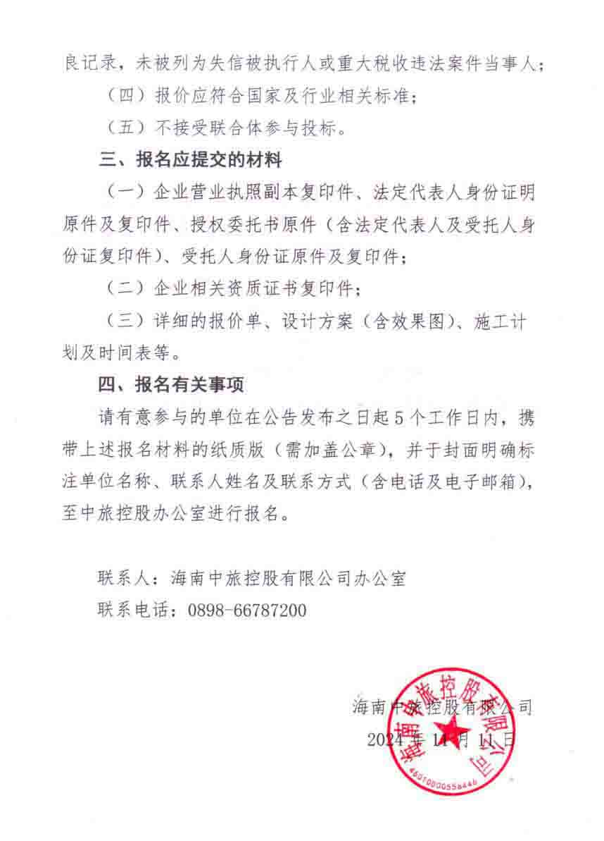 海南(nan)中(zhong)旅控股有(yǒu)限(xian)公(gōng)司關于(yu)公(gōng)開選聘裝(zhuang)修工(gong)程(cheng)施工(gong)單(dan)位的(de)公(gōng)告